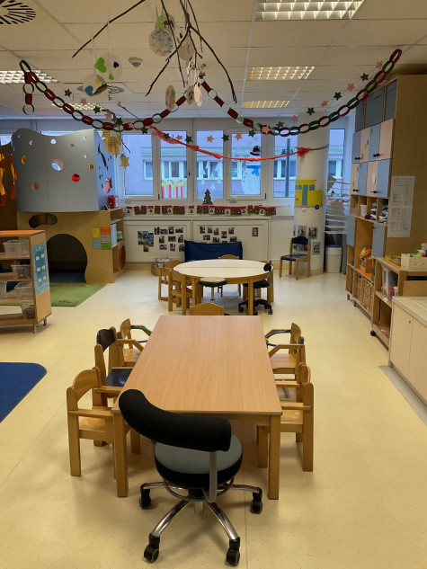 Kindgerechte Möbel und niedrige Spielmaterialien ermöglichen den Kindern, selbstständig zu handeln und ihre Umgebung aktiv zu erkunden. Rückzugsorte mit Polstern und Teppichen laden zum Kuscheln, Bilderbücher anschauen oder Ausruhen ein.