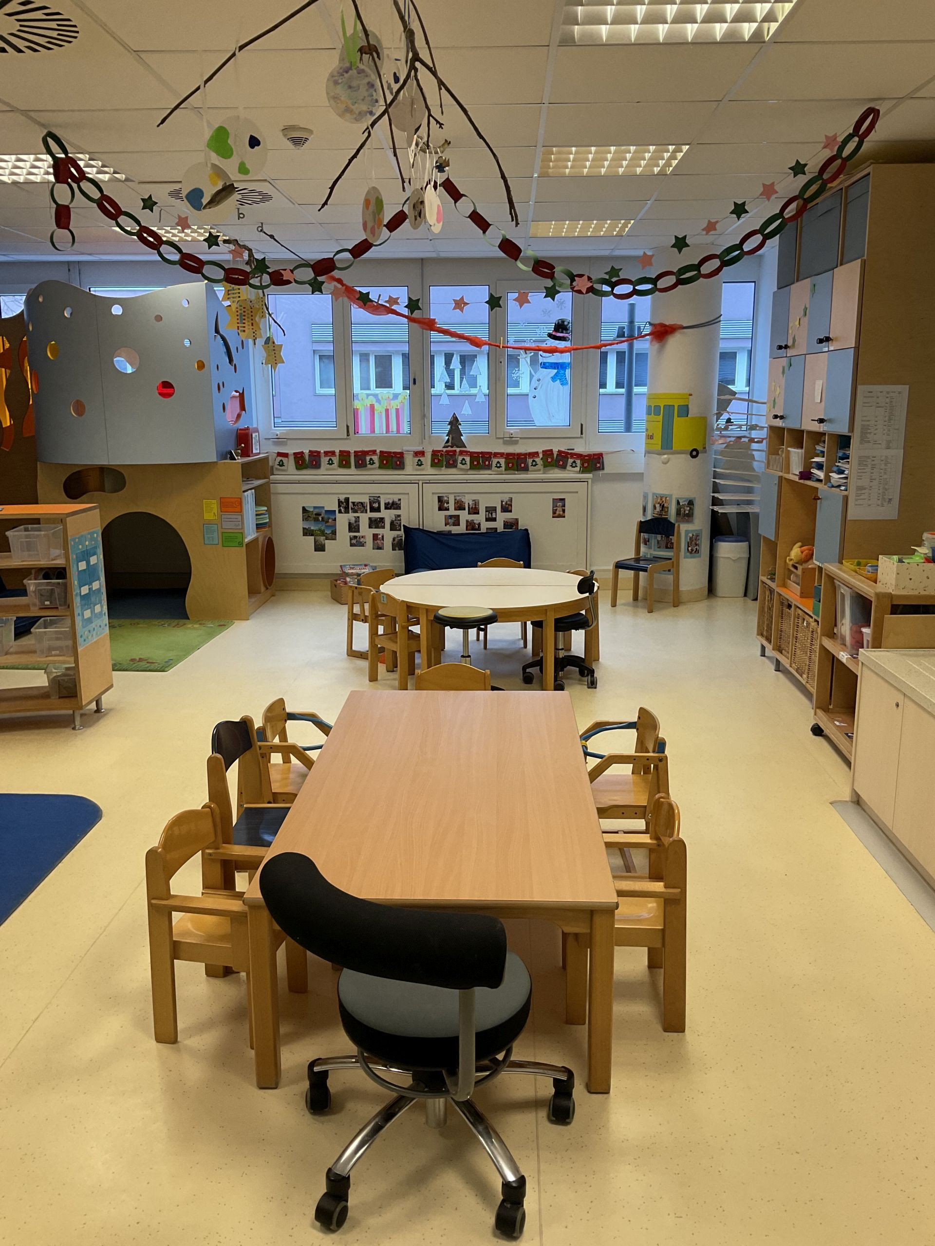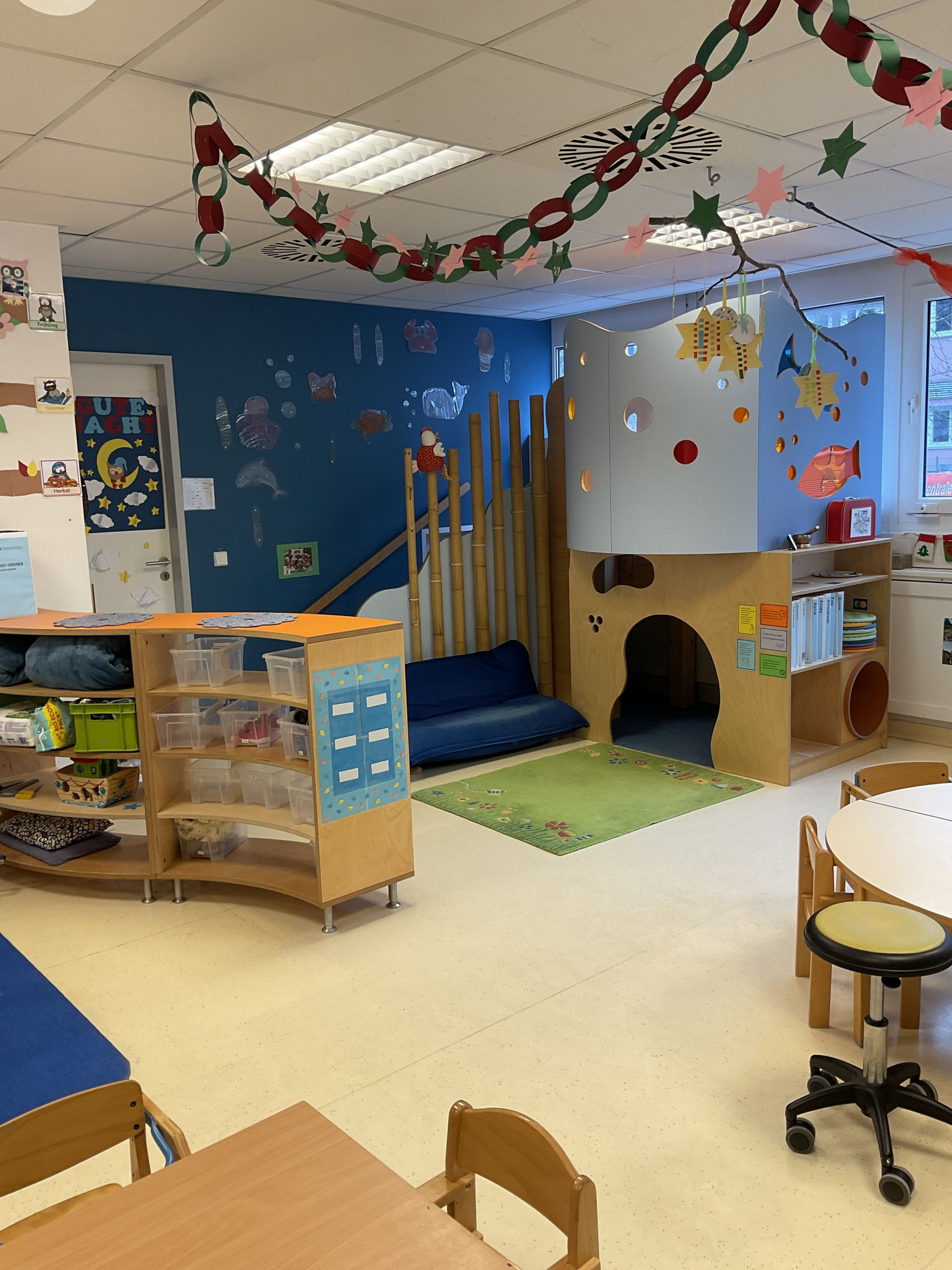 Die Blaue Gruppe ist als Krippengruppe speziell auf die Bedürfnisse der jüngsten Kinder ausgerichtet und bietet ihnen einen geschützten, überschaubaren Rahmen zum Ankommen, Entdecken und Wohlfühlen. Die Raumgestaltung ist klar strukturiert und zugleich gemütlich, sodass die Kinder Sicherheit erfahren und sich frei im Raum bewegen können.